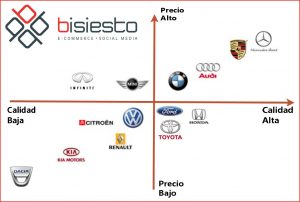 A continuación se muestra un ejemplo de la percepción de los consumidores sobre el precio y la calidad de las marcas en la industria del automóvil: